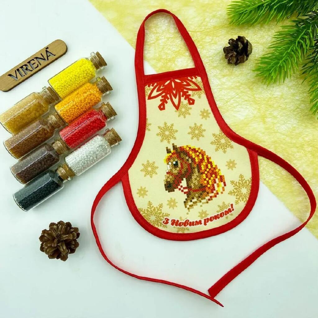 Фартух на пляшку для вишивання бісером має схему-малюнок надруковану на якісному габардині, якій проклеєно флізеліном. Схема чітка з насиченими кольорами та високою якістю друку. Після прання схема-малюнок для вишивки залишається на тканині. Краї фартуха обшиті косою бейкою, фартух повністю зшитий і не потребує додаткової роботи зі зшивання.
