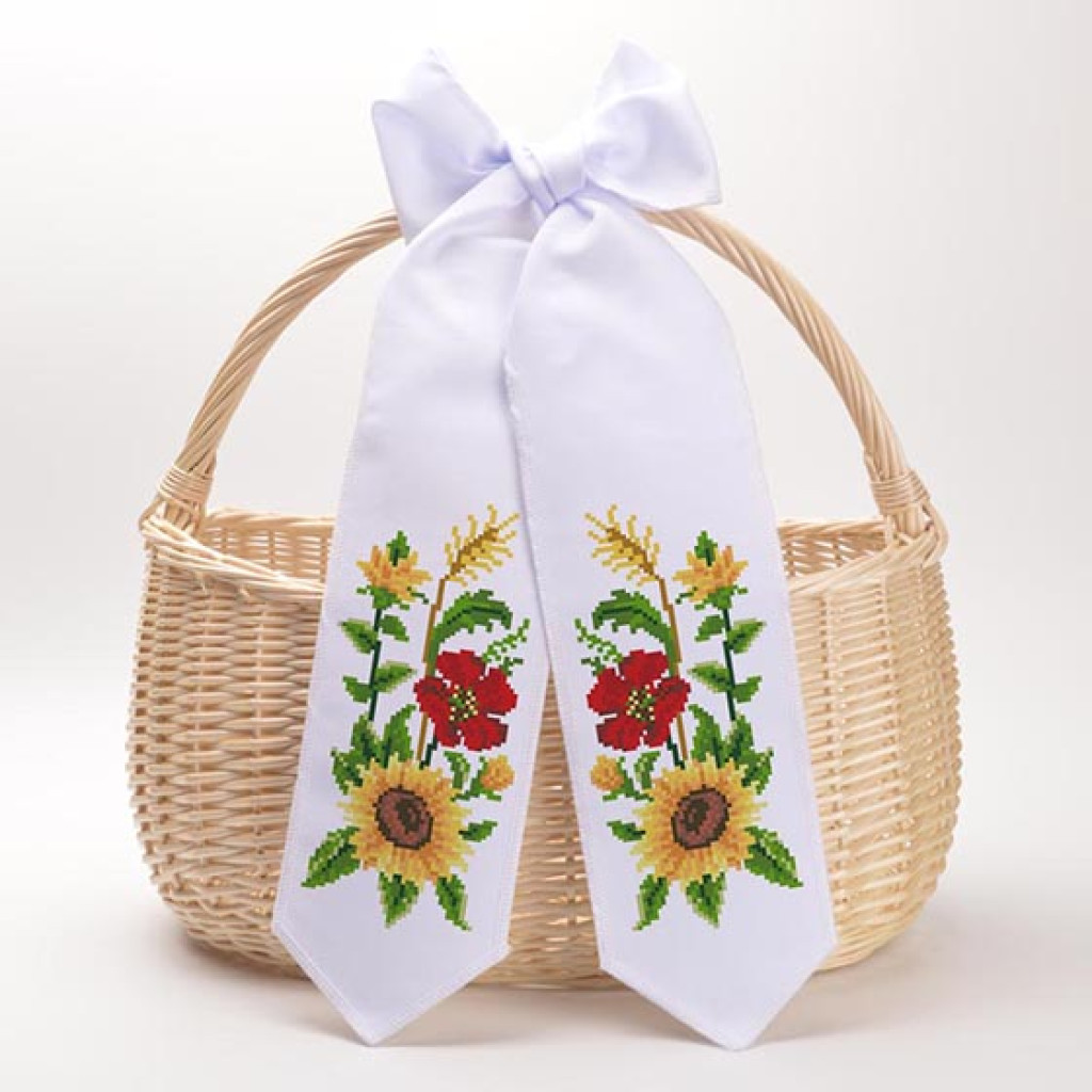 Святковий бант до Спаса для оздоблення кошика чи інтер’єру. Щільний габардин добре тримає форму, а чіткий друк схеми з ключем забезпечує зручний і передбачуваний процес вишивання.