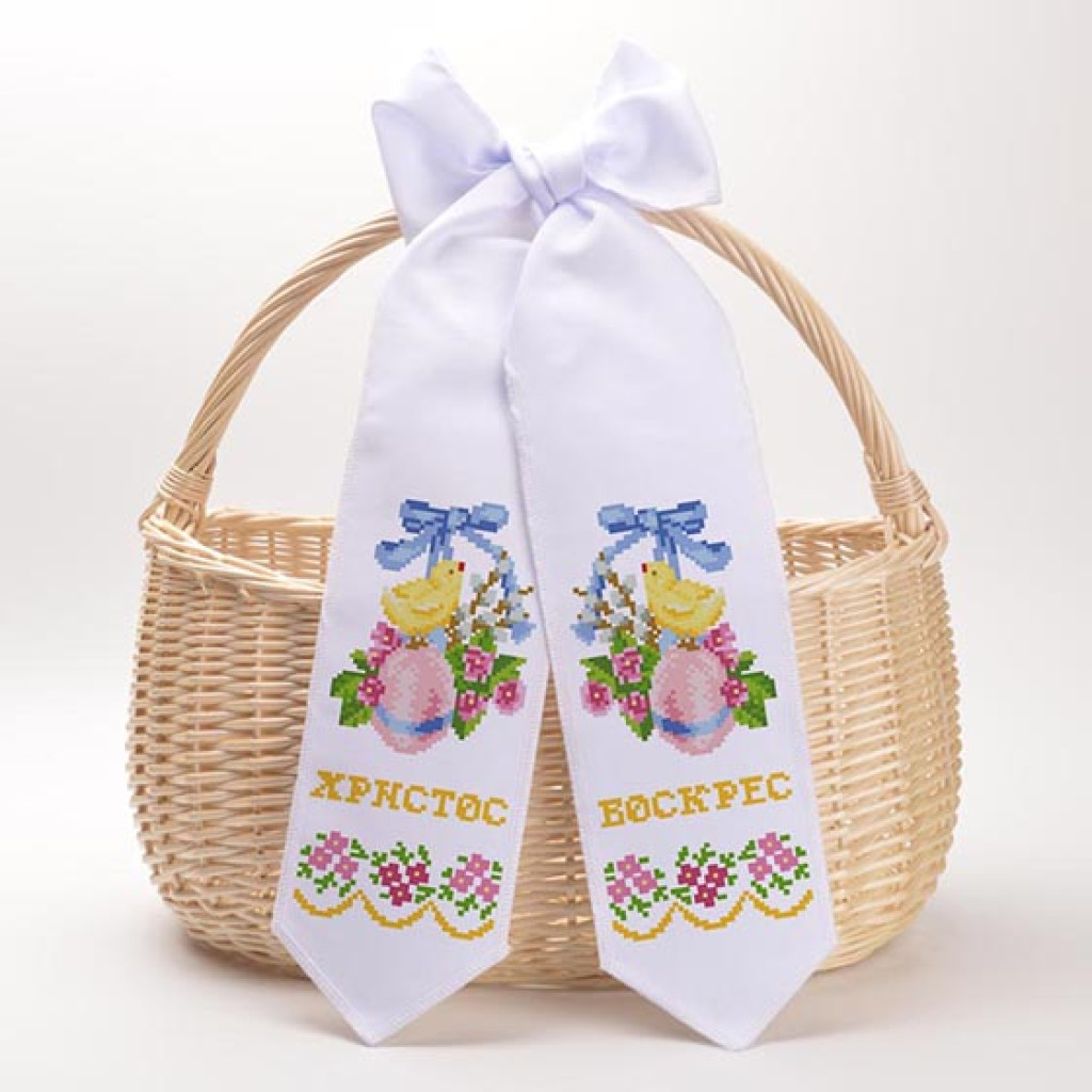 Набір для створення декоративного великоднього банта з нанесеним малюнком-схемою для вишивки бісером. Орнамент виконаний у святковому стилі та стане гарною прикрасою великоднього кошика.