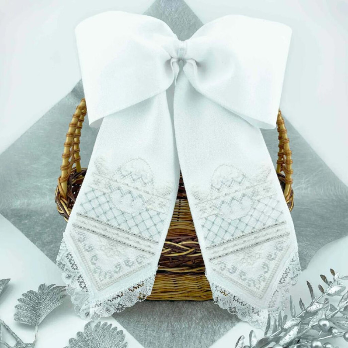 Великодній бант — стильне та символічне оздоблення для пасхального кошика. Дизайн поєднує традиційні мотиви з сучасною естетикою, створюючи ніжний та вишуканий акцент для святкового оформлення. Вишивка виконується хрестиком і декоративними шовчиками з доповненням бісером і бусинами, що надає виробу об’ємності та виразності.