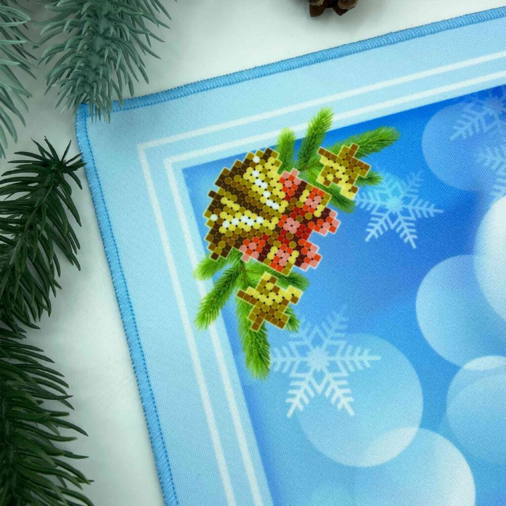 Набір для вишивки бісером серветки, виріб має чітку схему з насиченими кольорами та високою якістю друку на якісному габардині, якій проклеєно флізеліном. Після прання схема для вишивки залишається на тканині. Зрізи серветки фігурно обрізані.