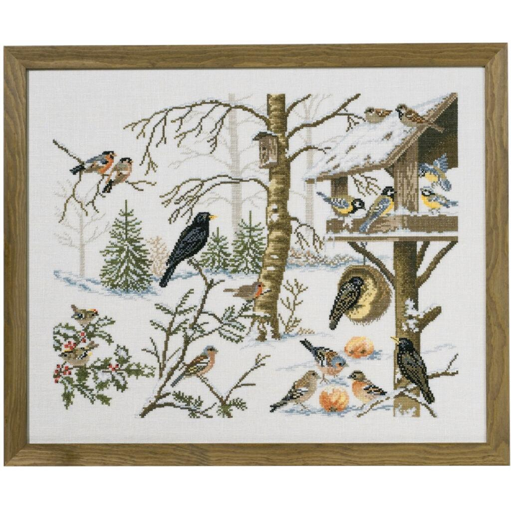 12-651 Eva Rosenstand Набір для вишивки рахунковим хрестиком - Птахи біля годівниці 55х45 см, Льон 26 ct