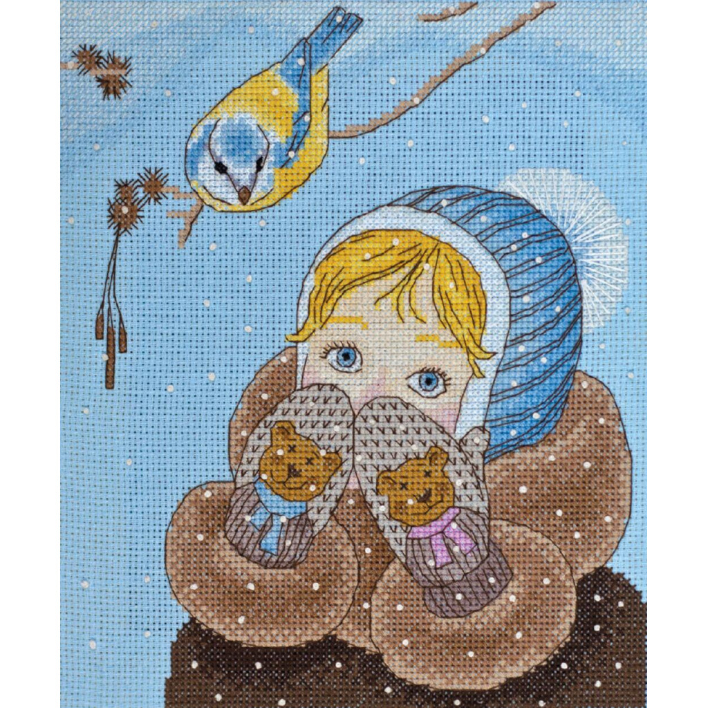 AH-020 Дівчинка і синичка. 18,5х21 см. АбрисАрт. Набір для вишивки хрестиком на Aida 14