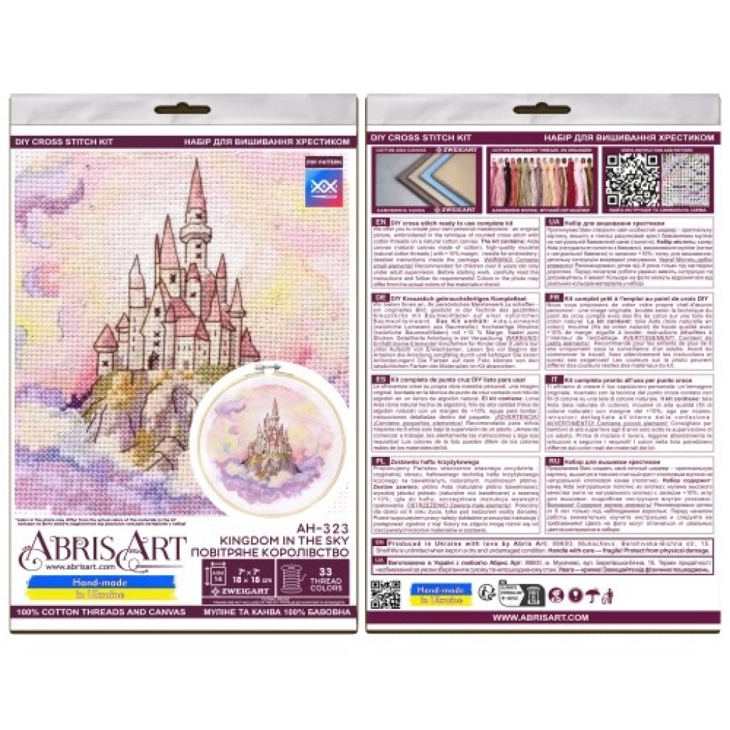 AH-323 Абрис Арт Повітряне королівство — набір для вишивки рахунковим хрестиком на канві Aida 14 ct. У комплекті передбачений великий відріз канви з достатнім запасом для зручного процесу вишивки та подальшого оформлення роботи. Схема спеціально розроблена дизайнерами виробника для цього сюжету, має чітку структуру та зрозуміле позначення символів, тому підходить як для досвідчених майстринь, так і для тих, хто тільки починає знайомство з технікою хрестика.