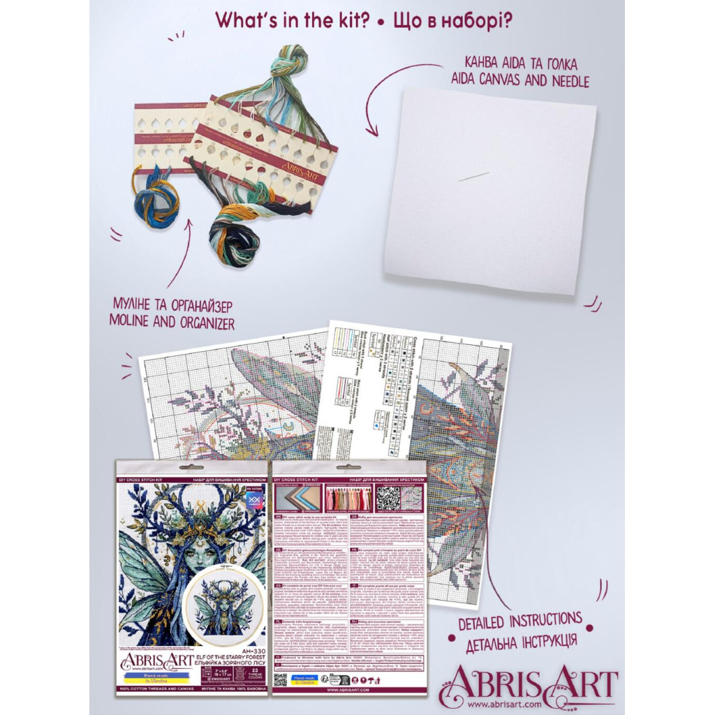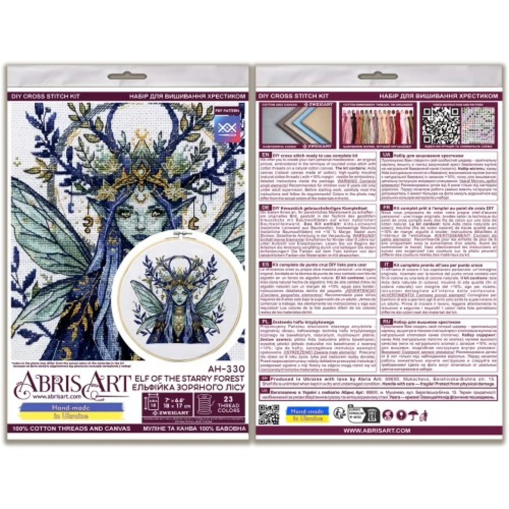AH-330 Абрис Арт Ельфійка зоряного лісу — набір для вишивки рахунковим хрестиком на канві Aida 18 ct. У комплекті передбачений великий відріз канви з достатнім запасом для зручного процесу вишивки та подальшого оформлення роботи. Схема спеціально розроблена дизайнерами виробника для цього сюжету, має чітку структуру та зрозуміле позначення символів, тому підходить як для досвідчених майстринь, так і для тих, хто тільки починає знайомство з технікою хрестика.