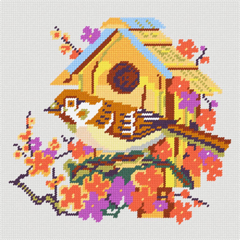 BE02 Чарівниця Набір для вишивки друкованим хрестиком - Горобець біля шпаківні 25x25 см (схема на канві)