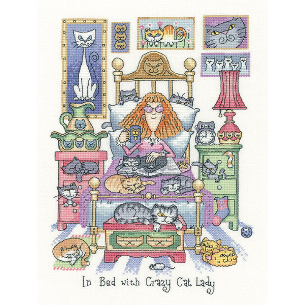 Набір для вишивки У ліжку з Crazy Cat Lady In Bed with Crazy Cat Lady створений у Великій Британії та поєднує високу якість матеріалів із витонченим англійським дизайном. Сюжет вирізняється реалістичністю, гармонійною палітрою кольорів та увагою до деталей. Завдяки якісній тканині та муліне DMC вишивка виглядає професійно й зберігає свій вигляд багато років.