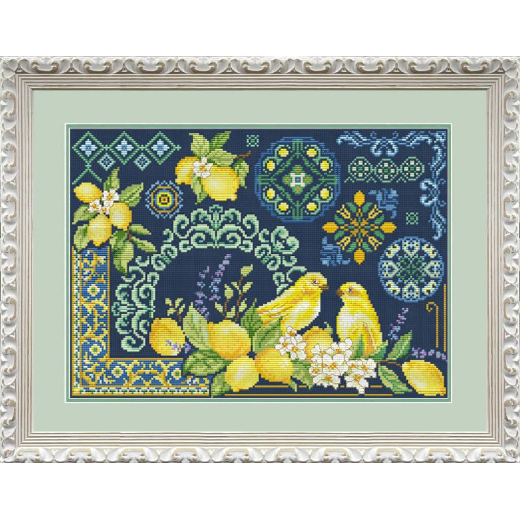 VN-272 Olanta Набір для вишивки рахунковим хрестиком - Канарейки в лимонах дозволяє створити яскраву картину з виразними деталями. Канва Aida Zweigart 16 зручна для рівних хрестиків, а чорно-біла схема із застосуванням кольорових символів допомагає впевнено контролювати процес. У дизайні передбачені акцентні елементи з бісеру Matsuno, що додають роботі декоративності та об’єму.