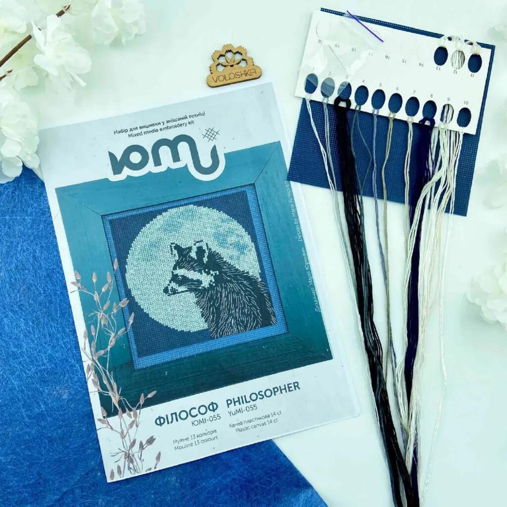 YuMI_055 Voloshka Набір для вишивки рахунковим хрестиком YuMI - Філософ призначений для створення невеликої картини на пластиковій канві. Основа з пластикової Aida 14 ct добре тримає форму, тому готову роботу зручно оформлювати як декоративний елемент. Дизайн виконується хрестиком і доповнюється швом «голка назад», а наявність люмінесцентної нитки додає виразного акценту. Розмір зашивки становить 12,7x12,7 см, розмір пластикової канви 15,5x15,5 см.