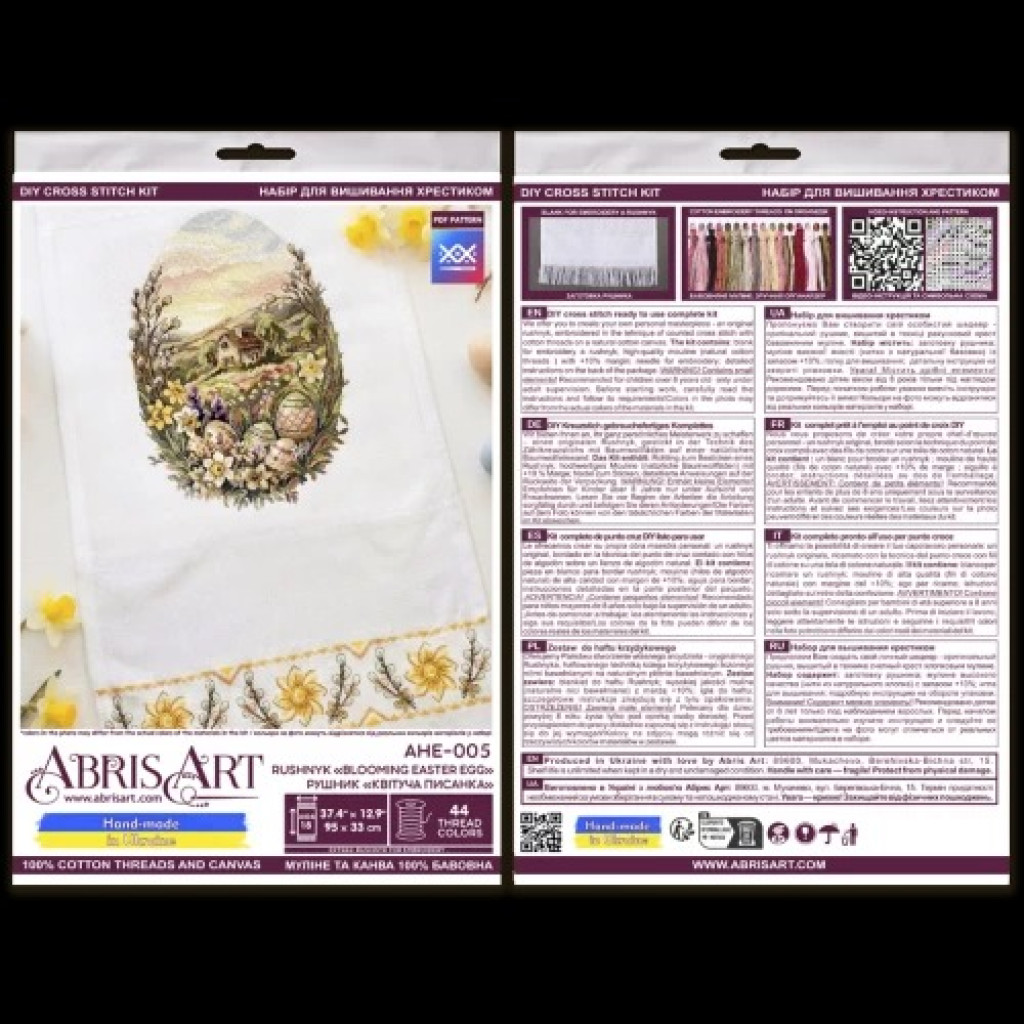 AHE-005 Абрис Арт Рушник Квітуча писанка — набір для вишивки хрестиком на заготовці рушника з канви Aida 18. Заготовка має достатній запас по розміру, бахрому та декоративні вставки, а широка вставка для вишивання передбачає висоту 30 см, що робить процес вишивки зручним і акуратним. Схема розроблена дизайнерами виробника для цього сюжету, має чіткі позначення та доповнена інструкцією, тому підійде як досвідченим майстриням, так і тим, хто лише починає працювати з вишивкою хрестиком.