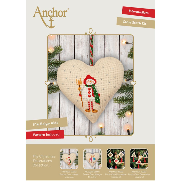 AKE0009-0002 Anchor Набір для вишивки рахунковим хрестиком - Іграшка Серце: Сніговик (Heart Snowman 15x15 см, Aida 14