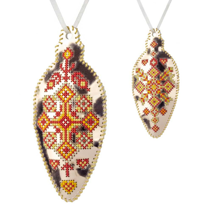 Кожен набір містить заготовки з якісної штучної шкіри, які ви вишиваєте нитками за схемою. Після завершення половинки легко зшиваються між собою і готова чарівна прикраса, яку можна повісити на ялинку за допомогою декоративної стрічки. Іграшка виходить двосторонньою, тобто однаково красивою з обох боків. Такі набори не лише прикрасять вашу ялинку, а й стануть чудовим подарунком для рукодільниці або для себе коханої.