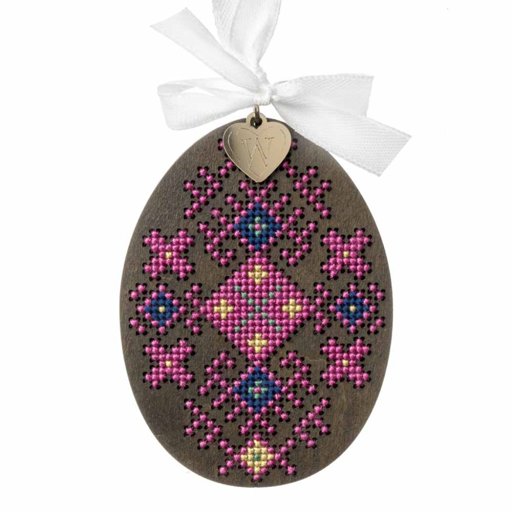 Набір для вишивки хрестиком по дерев’яній основі від української компанії Wonderland Crafts дозволяє створити декоративний виріб у формі писанки. Перфорована фанерна заготовка забезпечує зручний процес вишивки та допомагає отримати чіткий і акуратний результат.