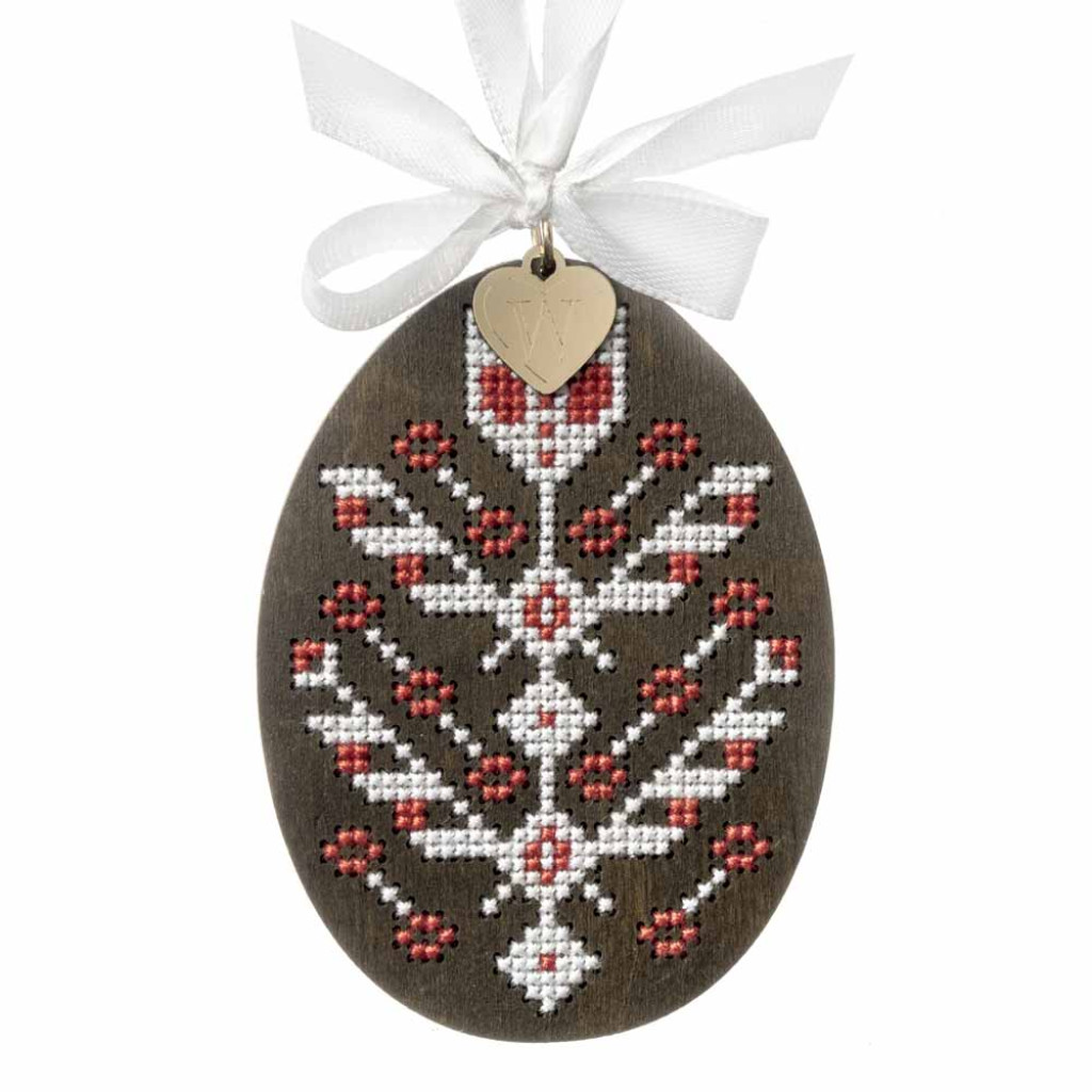 Набір для вишивки хрестиком по дерев’яній основі від української компанії Wonderland Crafts дозволяє створити декоративний виріб у формі писанки. Перфорована фанерна заготовка забезпечує зручний процес вишивки та допомагає отримати чіткий і акуратний результат.