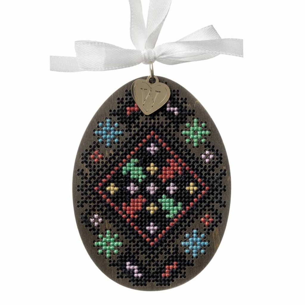 Набір для вишивки хрестиком по дерев’яній основі від української компанії Wonderland Crafts дозволяє створити декоративний виріб у формі писанки. Перфорована фанерна заготовка забезпечує зручний процес вишивки та допомагає отримати чіткий і акуратний результат.