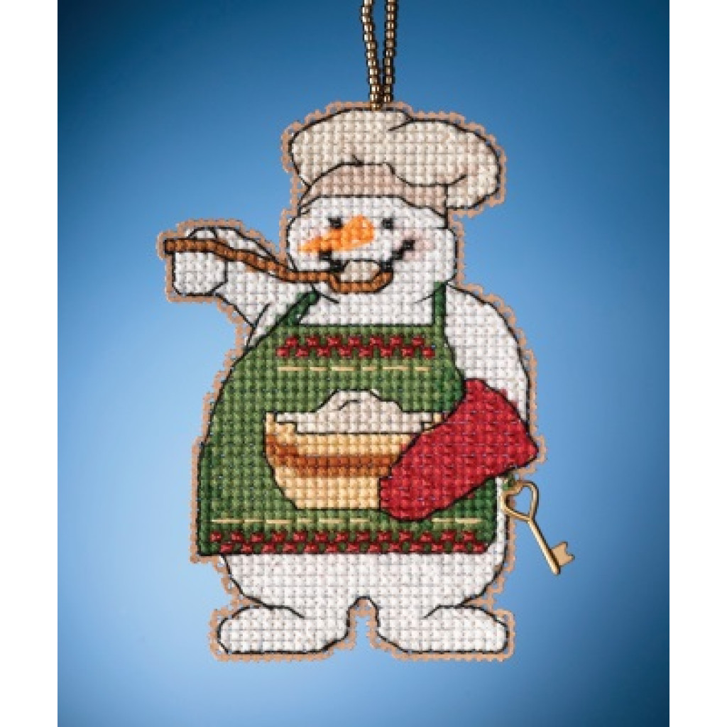 Набір для вишивки Сніговик кухар Cooking Snowman — декоративний орнамент на перфорованому папері. Поєднання хрестика, скляного бісеру та декоративних підвісок (charms) надає виробу рельєфу й святкового блиску. У комплекті є шнурок-петля з бісеру для зручного підвішування.