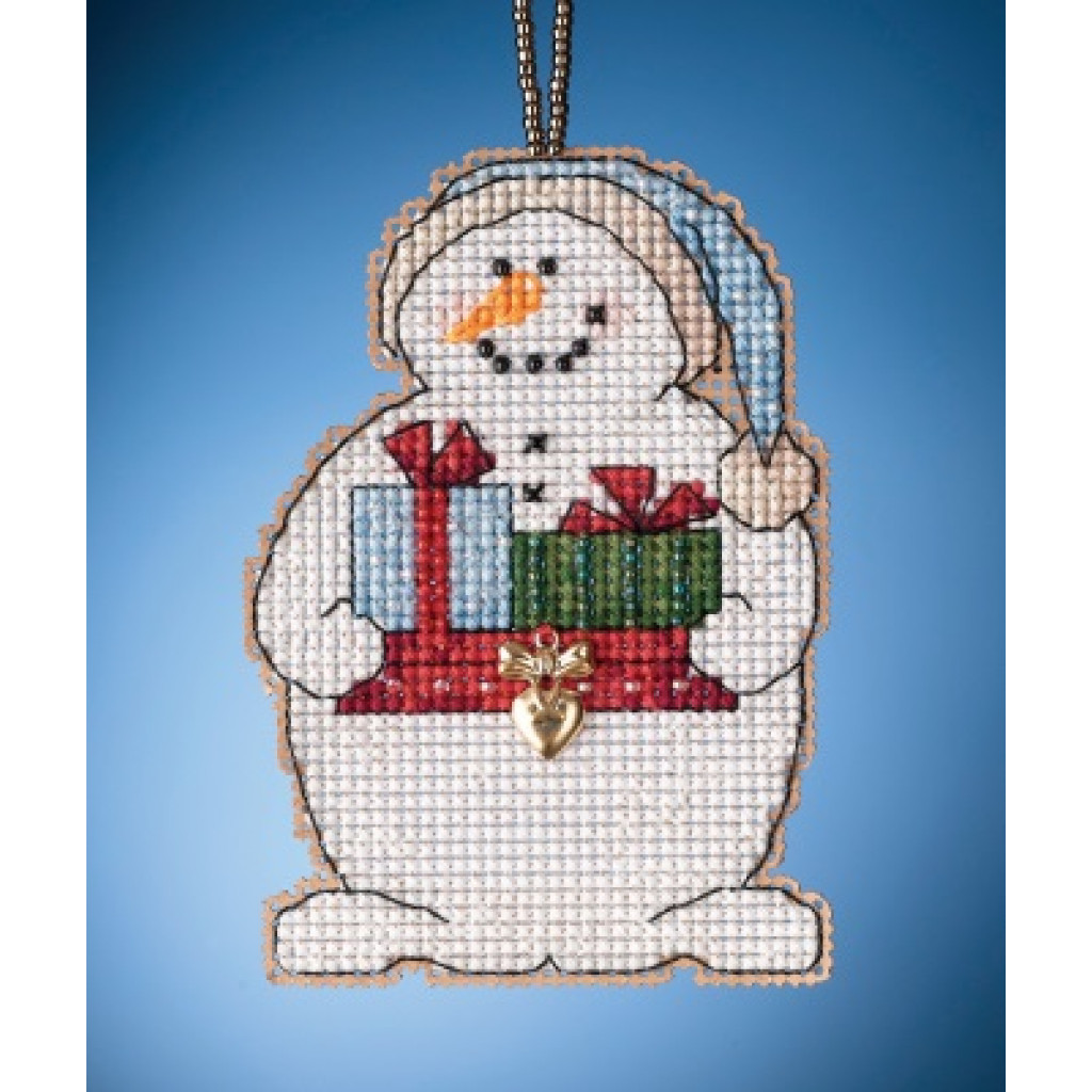 Набір для вишивки Сніговик з дарунками Giving Snowman — декоративний орнамент на перфорованому папері. Поєднання хрестика, скляного бісеру та декоративних підвісок (charms) надає виробу рельєфу й святкового блиску. У комплекті є шнурок-петля з бісеру для зручного підвішування.