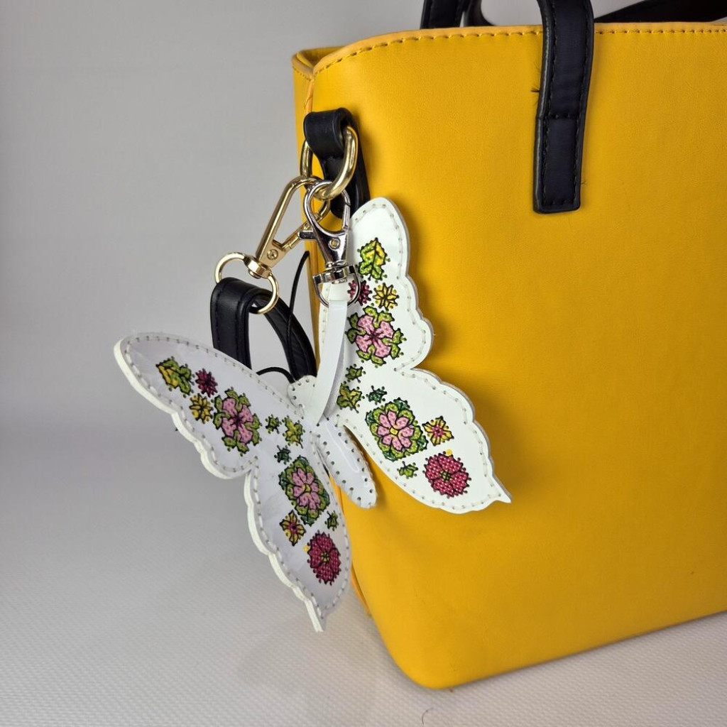 Після завершення вишивки деталі зшиваються між собою, формуючи об’ємний двосторонній шарм. Готовий виріб можна використовувати як прикрасу для сумки, рюкзака або ключів, додаючи індивідуальності повсякденним аксесуарам.