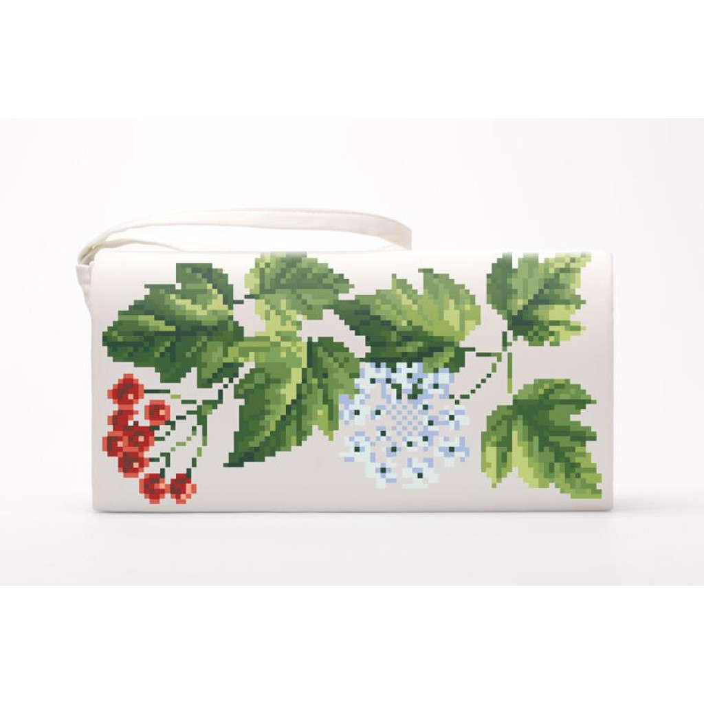 Набір для вишивки нитками пошитого клатча Цвіт калини від Барвиста вишиванка призначений для часткової зашивки друкованим хрестиком. Малюнок-схема нанесений безпосередньо на шовкову тканину бежевого кольору стійкими екологічними фарбами, що не змиваються під час дбайливого прання. Заготовка клатча вже пошита, тому ви одразу працюєте з готовою формою виробу, а вишитий візерунок надає аксесуару виразного та доглянутого вигляду.