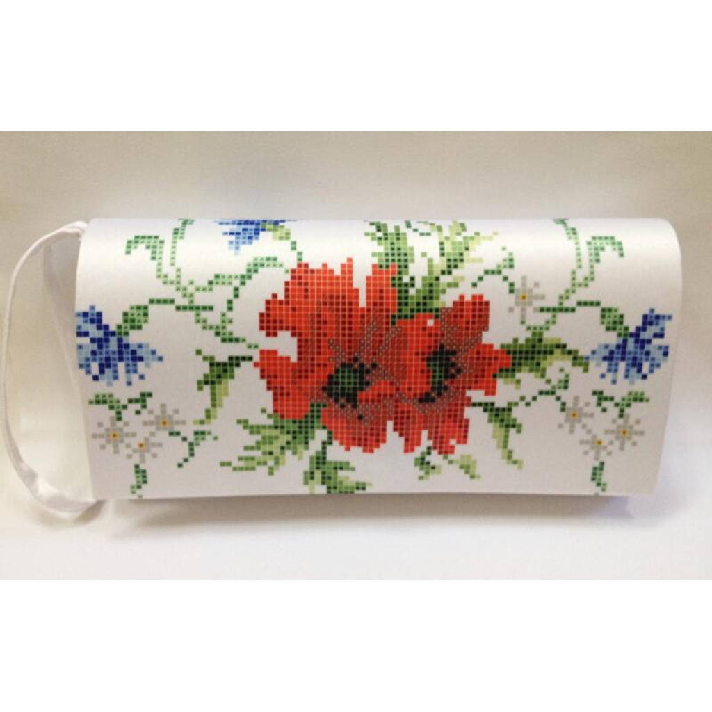 Набір для вишивки нитками пошитого клатча Ніжні маки, волошки, колоски від Барвиста вишиванка призначений для часткової зашивки друкованим хрестиком. Малюнок-схема надрукований безпосередньо на атласній тканині білого кольору стійкими екологічними фарбами, що не змиваються під час дбайливого прання. Заготовка клатча вже пошита, тому ви одразу працюєте з готовою формою виробу, а вишитий візерунок надає аксесуару охайного та виразного вигляду.
