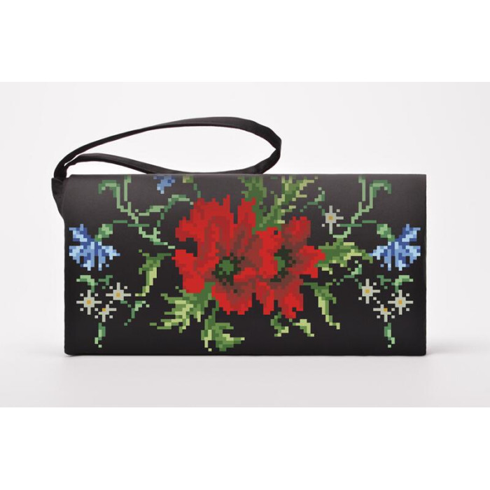Набір для вишивки нитками пошитого клатча Ніжні маки, волошки, колоски від Барвиста вишиванка призначений для часткової зашивки друкованим хрестиком. Малюнок-схема надрукований безпосередньо на атласній тканині чорного кольору стійкими екологічними фарбами, що не змиваються під час дбайливого прання. Заготовка клатча вже пошита, тому ви одразу працюєте з готовою формою виробу, а вишитий візерунок надає аксесуару охайного та виразного вигляду.