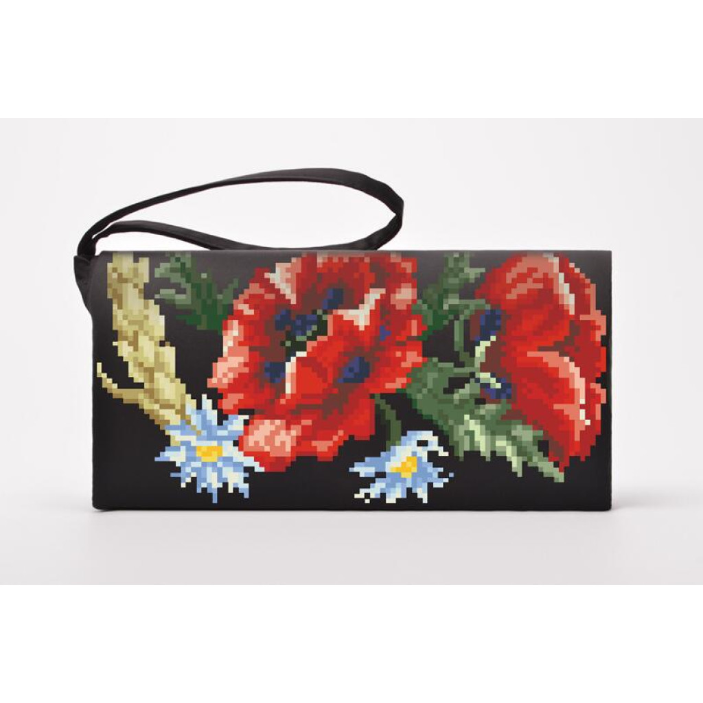 Набір для вишивки нитками пошитого клатча Червоні маки, ромашки, колоски від Барвиста вишиванка призначений для часткової зашивки друкованим хрестиком. Малюнок-схема нанесений безпосередньо на лляну тканину чорного кольору стійкими екологічними фарбами, що не змиваються під час дбайливого прання. Заготовка клатча вже пошита, тому ви одразу працюєте з готовою формою виробу, а вишитий візерунок надає аксесуару охайного та виразного вигляду.