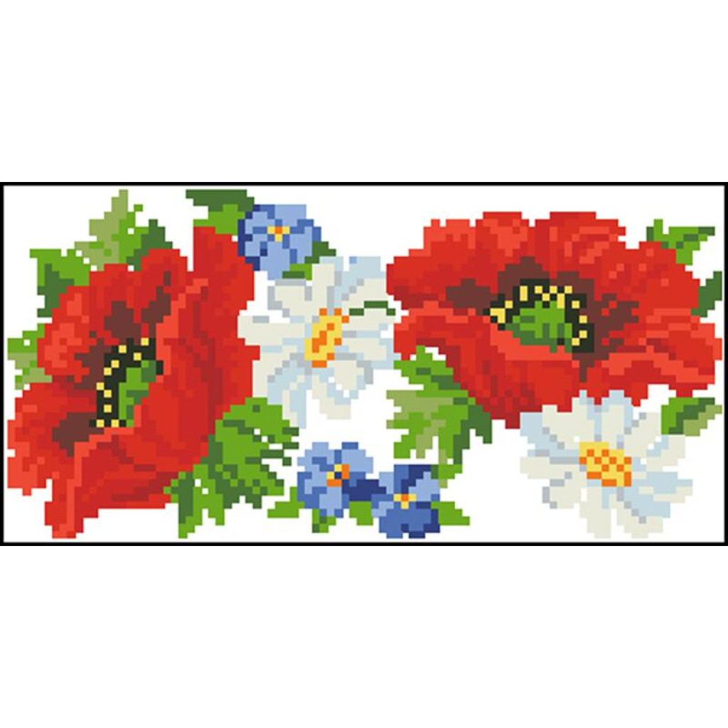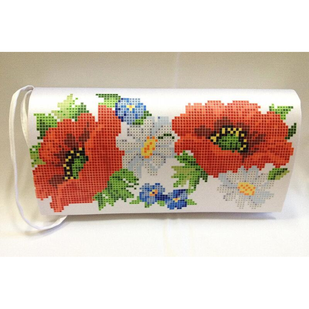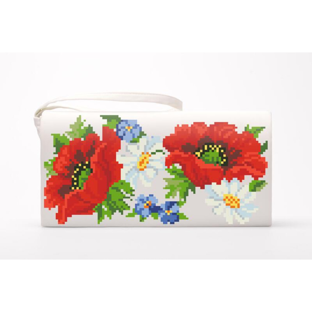 Набір для вишивки нитками пошитого клатча Маки, ромашки, незабудки від Барвиста вишиванка призначений для часткової зашивки друкованим хрестиком. Малюнок-схема нанесений безпосередньо на габардин білого кольору стійкими екологічними фарбами, що не змиваються під час дбайливого прання. Заготовка клатча вже пошита, тому ви одразу працюєте з готовою формою виробу, а вишитий візерунок надає аксесуару охайного та виразного вигляду.