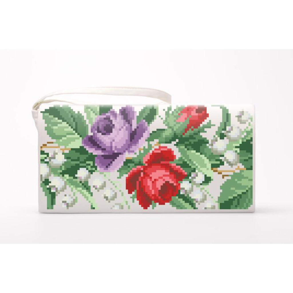 Набір для вишивки нитками пошитого клатча Троянди і конвалії від Барвиста вишиванка призначений для часткової зашивки друкованим хрестиком. Малюнок-схема нанесений безпосередньо на домоткане полотно бежевого кольору стійкими екологічними фарбами, що не змиваються під час дбайливого прання. Заготовка клатча вже пошита, тому ви одразу працюєте з готовою формою виробу, а вишитий візерунок надає аксесуару охайного та виразного вигляду.