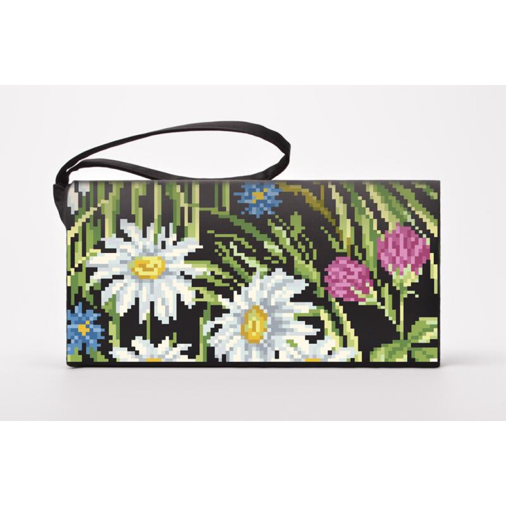 Набір для вишивки нитками пошитого клатча Ромашки, волошки, дзвіночки від Барвиста вишиванка призначений для часткової зашивки друкованим хрестиком. Малюнок-схема надрукований безпосередньо на атласній тканині чорного кольору стійкими екологічними фарбами, що не змиваються під час дбайливого прання. Заготовка клатча вже пошита, тому ви одразу працюєте з готовою формою виробу, а вишитий візерунок надає аксесуару охайного та виразного вигляду.