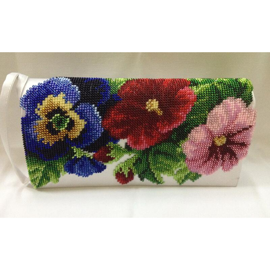 КЛ351кБ1301i Барвиста вишиванка Набір для вишивки друкованим хрестиком - Клатч Мальви, троянди, братки 21x13 см атлас, білий