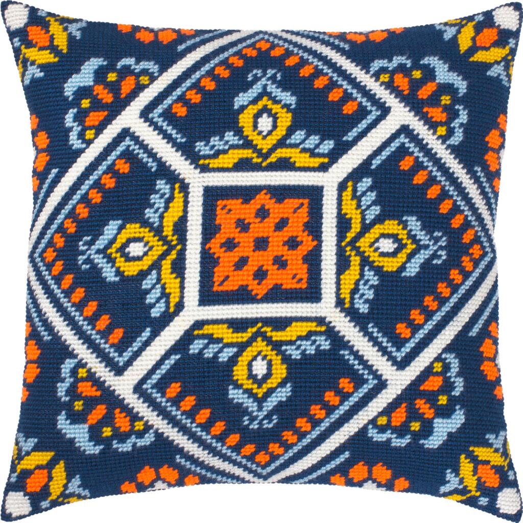 Вишивка виконується напівхрестиком у гобеленовій техніці, що надає виробу щільної текстури та виразності орнаменту. Готову вишивку можна оформити у наволочку (потрібна зворотна частина тканини) або використати як яскравий декоративний елемент інтер’єру.
