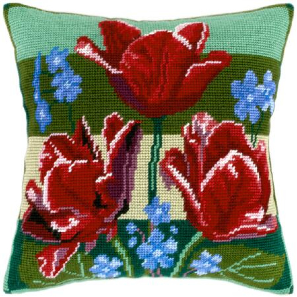 V23 Чарівниця Набір для вишивки друкованим напівхрестиком - Подушка Тюльпани і незабудки 40x40 см (схема на канві)
