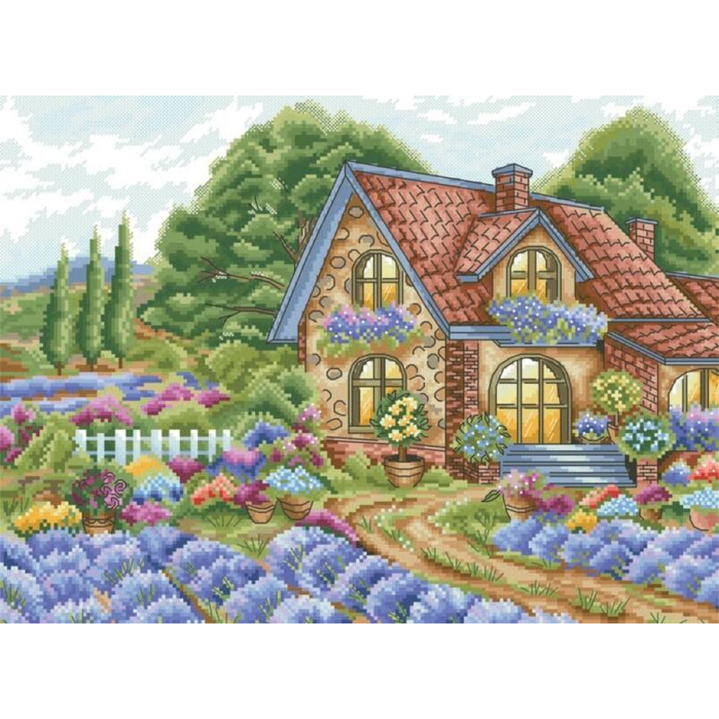 14-187 Інстинкт вишивання Схема на канві для вишивки хрестиком - Будинок в лаванді 33x45 см, Aida 14 (з паперовою схемою)