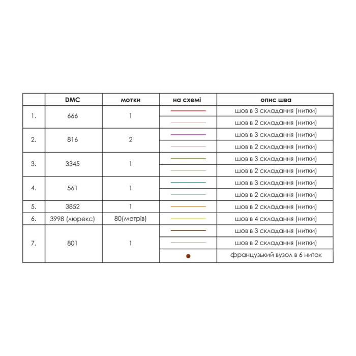 Виробник рекомендує використовувати номери та кольори муліне DMC.