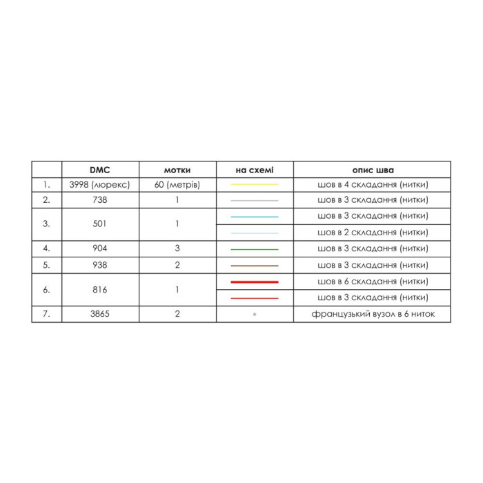 Виробник рекомендує використовувати номери та кольори муліне DMC.