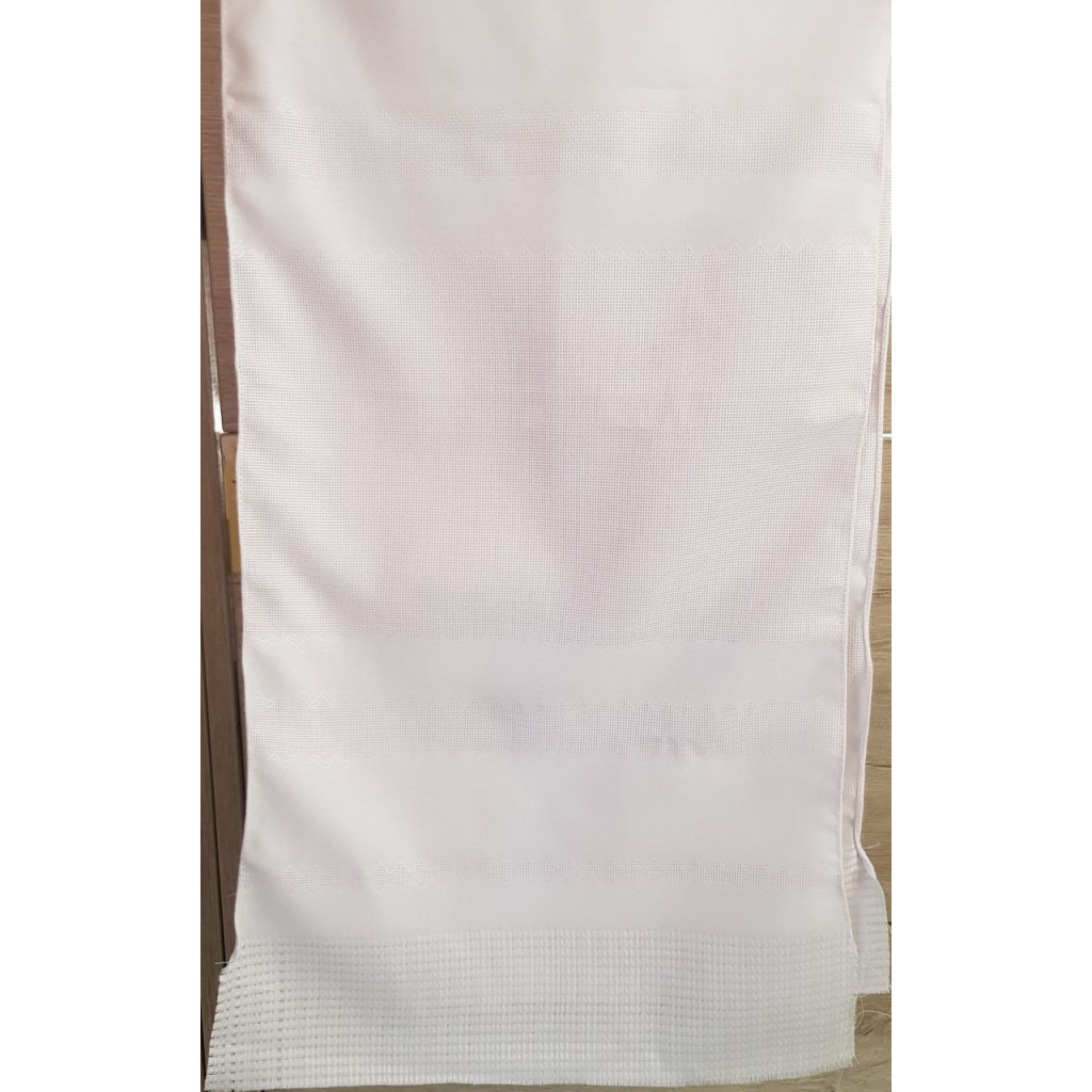 Заготовка має оброблені краї та зручний формат полотна для створення весільних, святкових і декоративних рушників. Чиста біла основа підкреслює орнамент і робить кольори ниток виразними. Повздовжні краї рушника підшиті, без бахроми, її потрібно зробити самотужки, витягнувши нитки. Виробник не робить бахрому, щоб вона не заважала процесу вишивки.