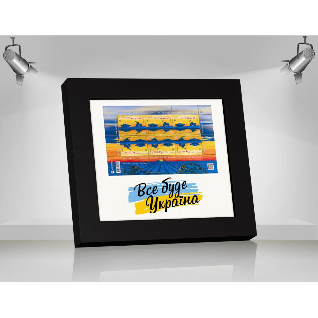 Фоторамка для марки W Доброго вечора "Все буде Україна" 18.6-20.7 під марку 10.2-16.2 багетDL3005-02 чорний (з антибліковим склом 2мм, паспарту біле, двп) EmojiFrame