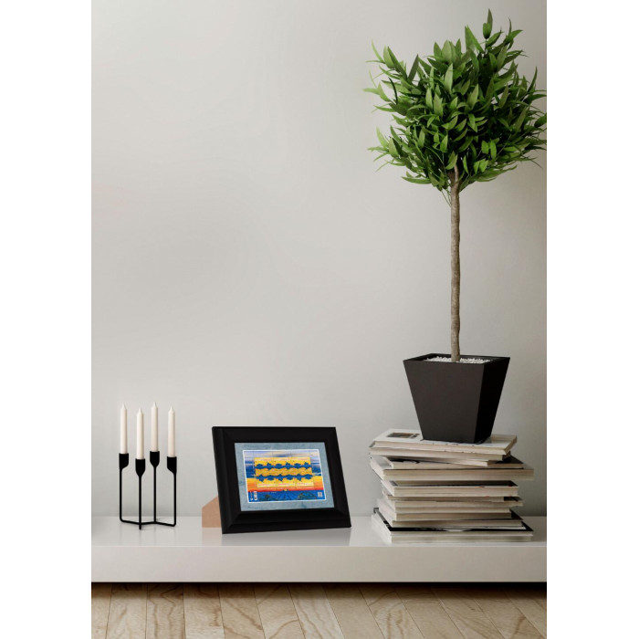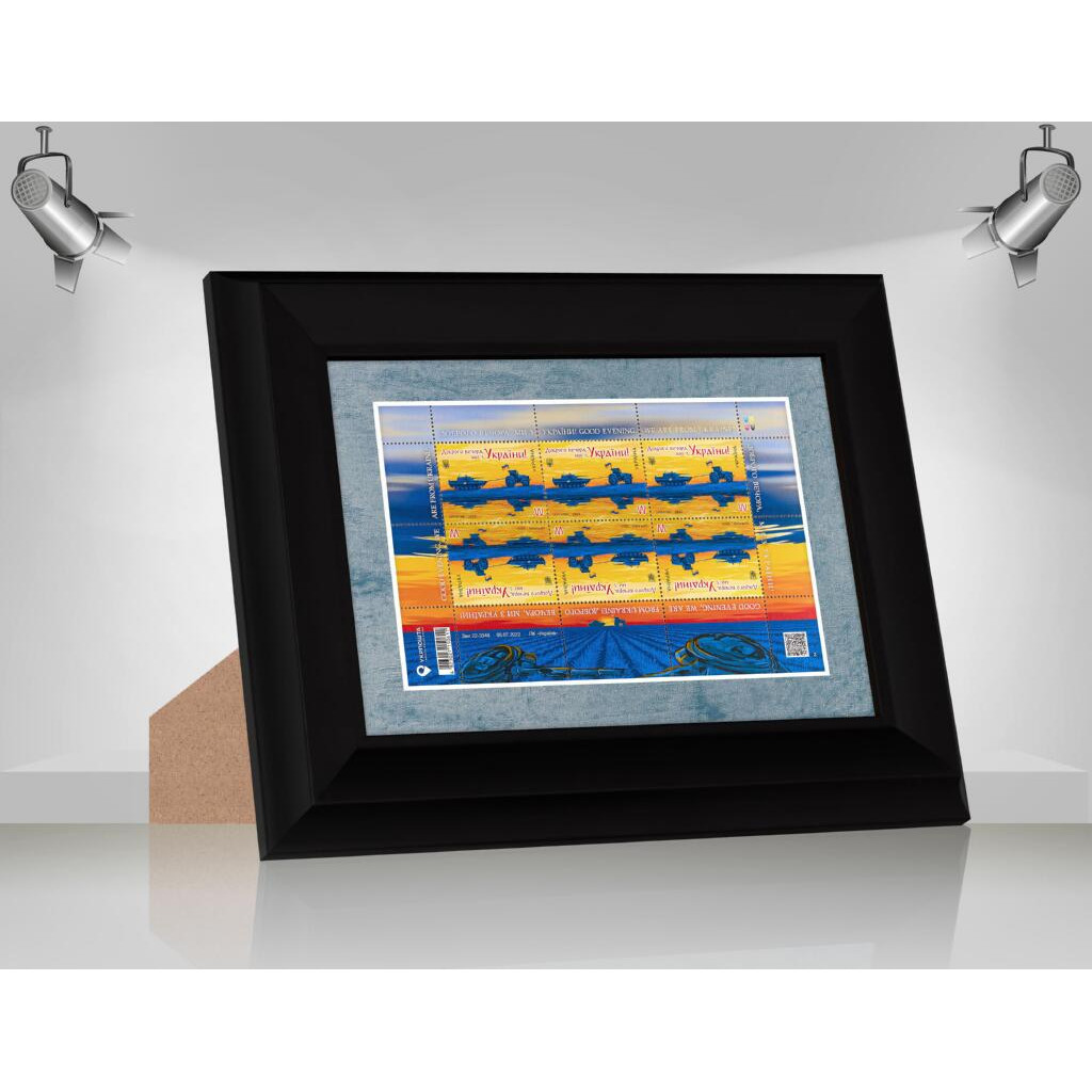 Фоторамка для марки W "Доброго вечора, ми з України!" 14.6-20.7 під марку 10.2-16.2 багет: DL3701-01 чорний (з антибліковим склом 2мм, паспарту блакитне, двп з ніжкою) EmojiFrame