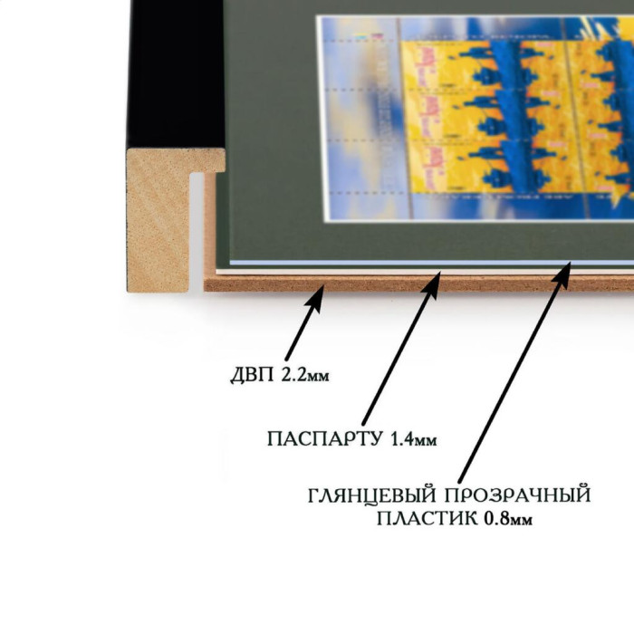 Фоторамка для марки W "Доброго вечора, ми з України!" 14.6-20.7 під марку 10.2-16.2 багет: DL1805-01 чорний (з глянцевим прозорим пластиком 0.8мм, паспарту темно-зелене, двп з ніжкою) EmojiFrame