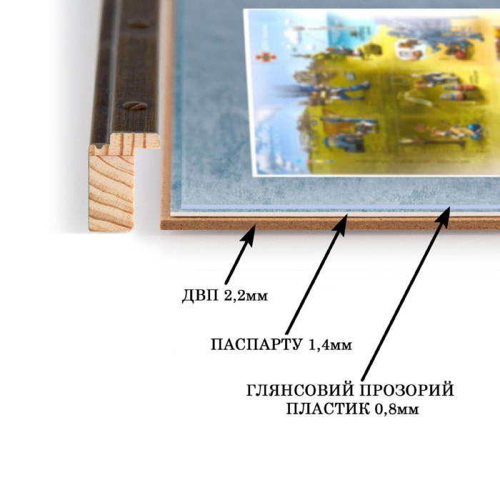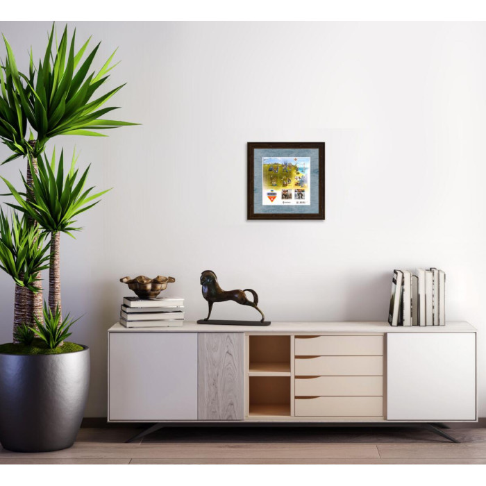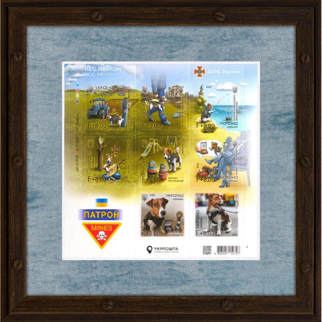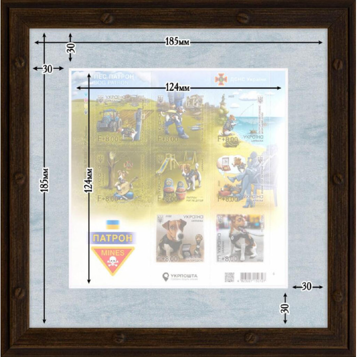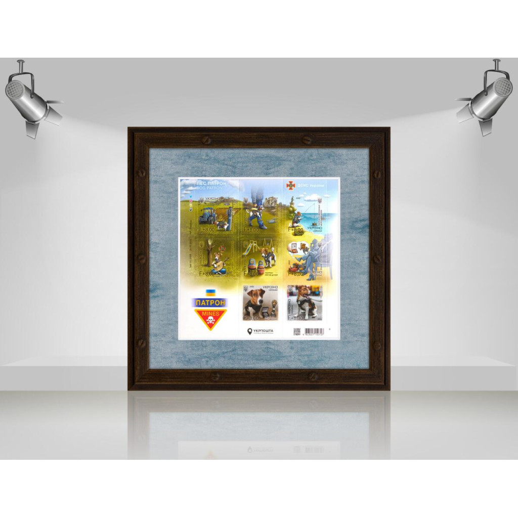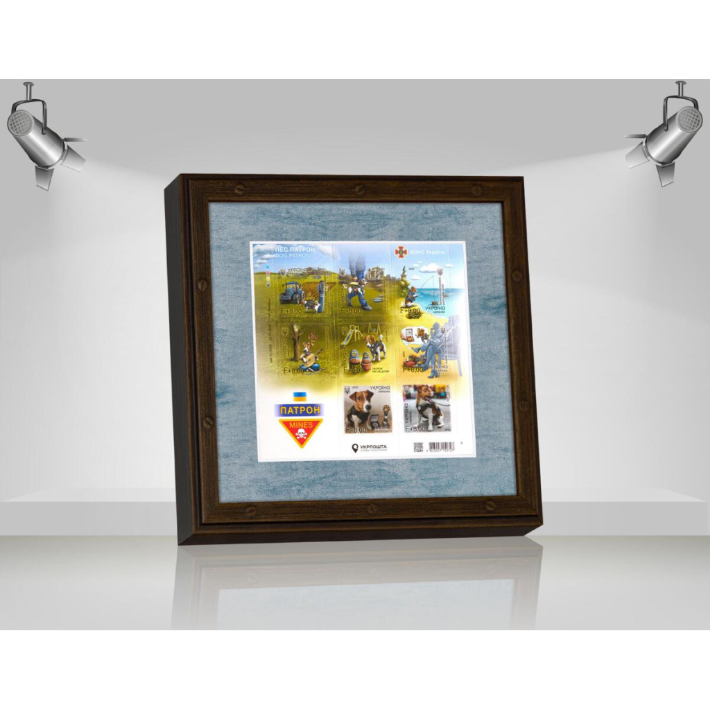 Фоторамка для марки F Пес Патрон 18.5-18.5 під марку 12.4-12.4 багет: DL1903-03 бронза (з глянцевим прозорим пластиком 0.8мм, паспарту блакитне, двп) EmojiFrame