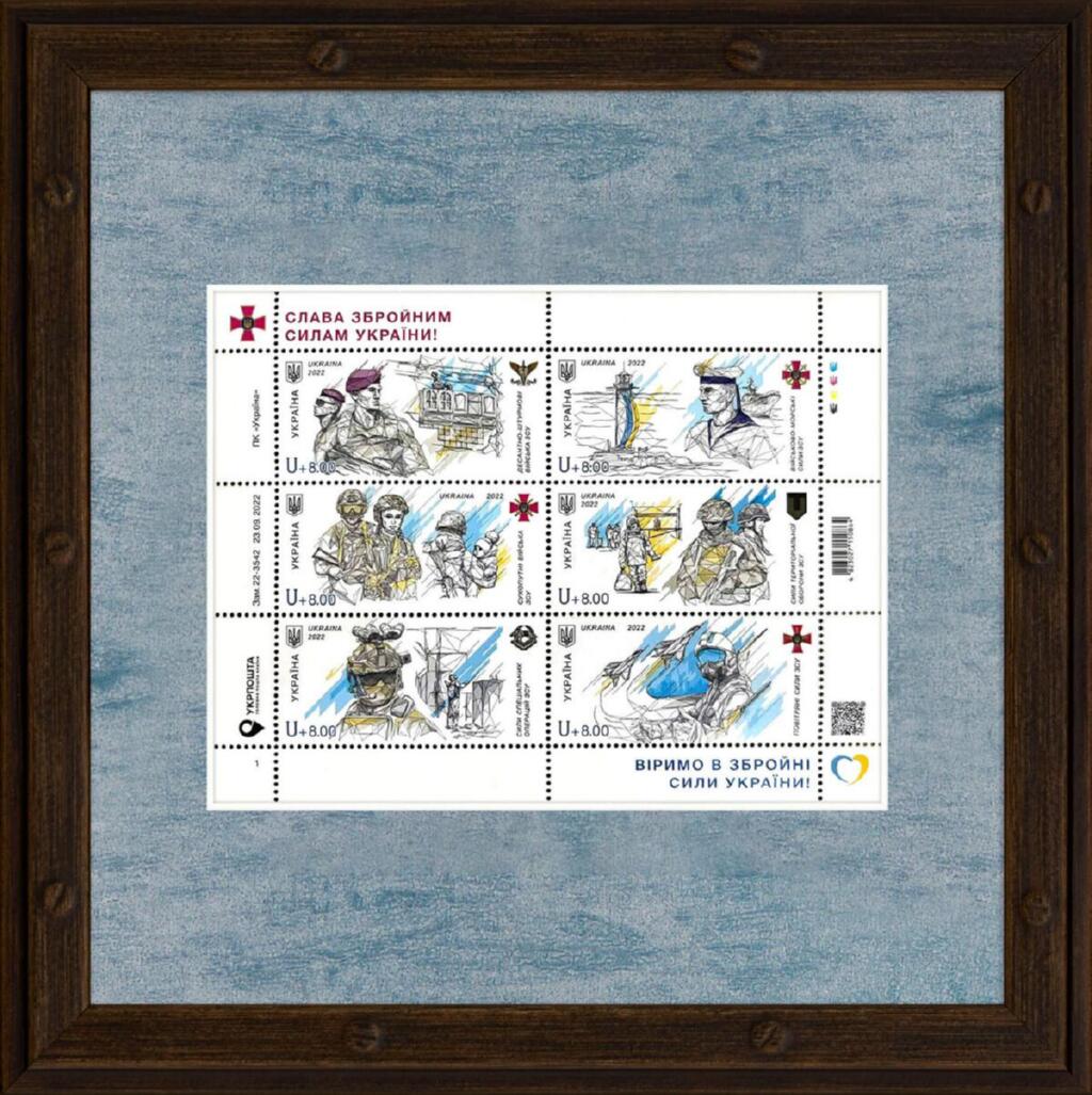 Фоторамка для марки U Слава ЗСУ 18.5-18.5 під марку 9.8-12.8 багет: DL1903-03 бронза (з антибліковим склом 2мм, паспарту блакитне, двп з ніжкою) EmojiFrame