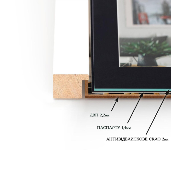 Рамка для фото дерев'яна 20х30 під фото 15х20 багет: DL3005-01 Білий (з антивідблисковим склом 2мм, паспарту чорне, двп) EmojiFrame
