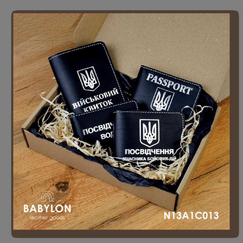 N13A1C013 Babylon Набір обкладинок: військовий квиток, УБД, посвідчення водія та ID-passport 26x17x5 см чорний, срібне тиснення, біла нитка, шкіра