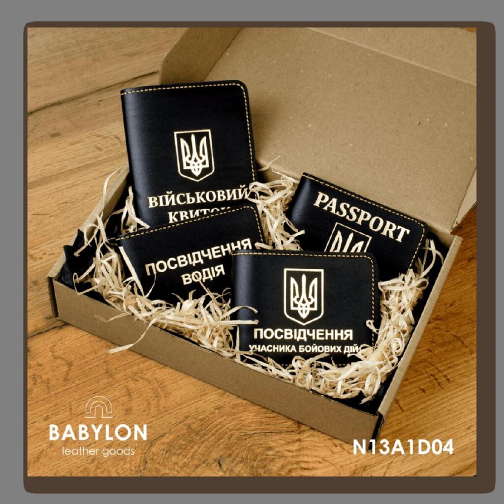 N13A1D04 Babylon Набір обкладинок: військовий квиток, УБД, посвідчення водія та ID-passport 26x17x5 см чорний, золоте тиснення, жовта нитка, шкіра