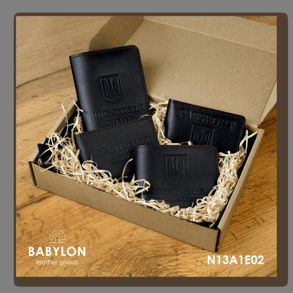 N13A1E02 Babylon Набір обкладинок: військовий квиток, УБД, посвідчення водія та ID-passport 26x17x5 см чорний, чисте тиснення, червона нитка, шкіра