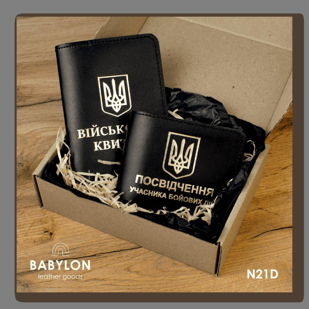 N21D Babylon Набір обкладинок: військовий квиток та УБД 18,5x12 см, 5x5 см чорний, золоте тиснення, шкіра