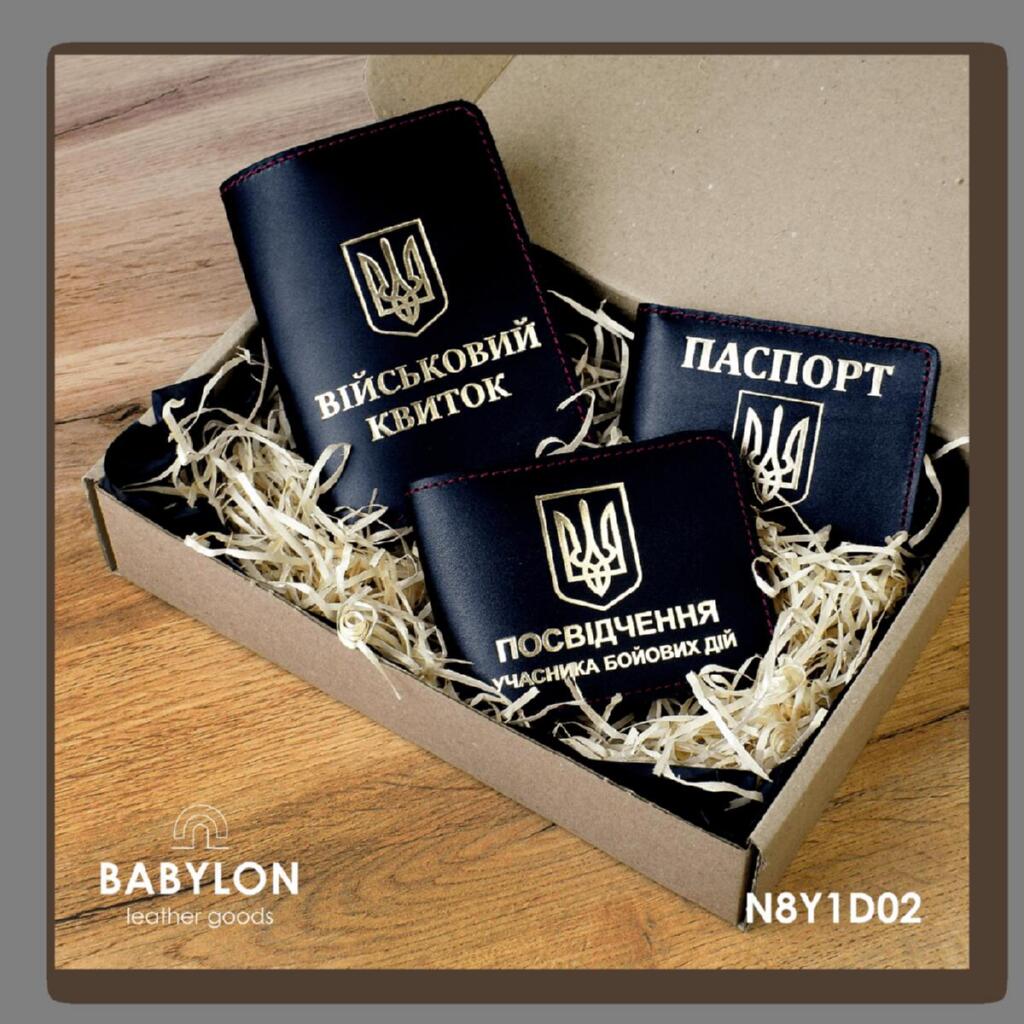 N8Y1D02 Babylon Набір обкладинок: військовий квиток, УБД та ID-паспорт 26x17x5 см чорний, золоте тиснення, червона нитка, шкіра