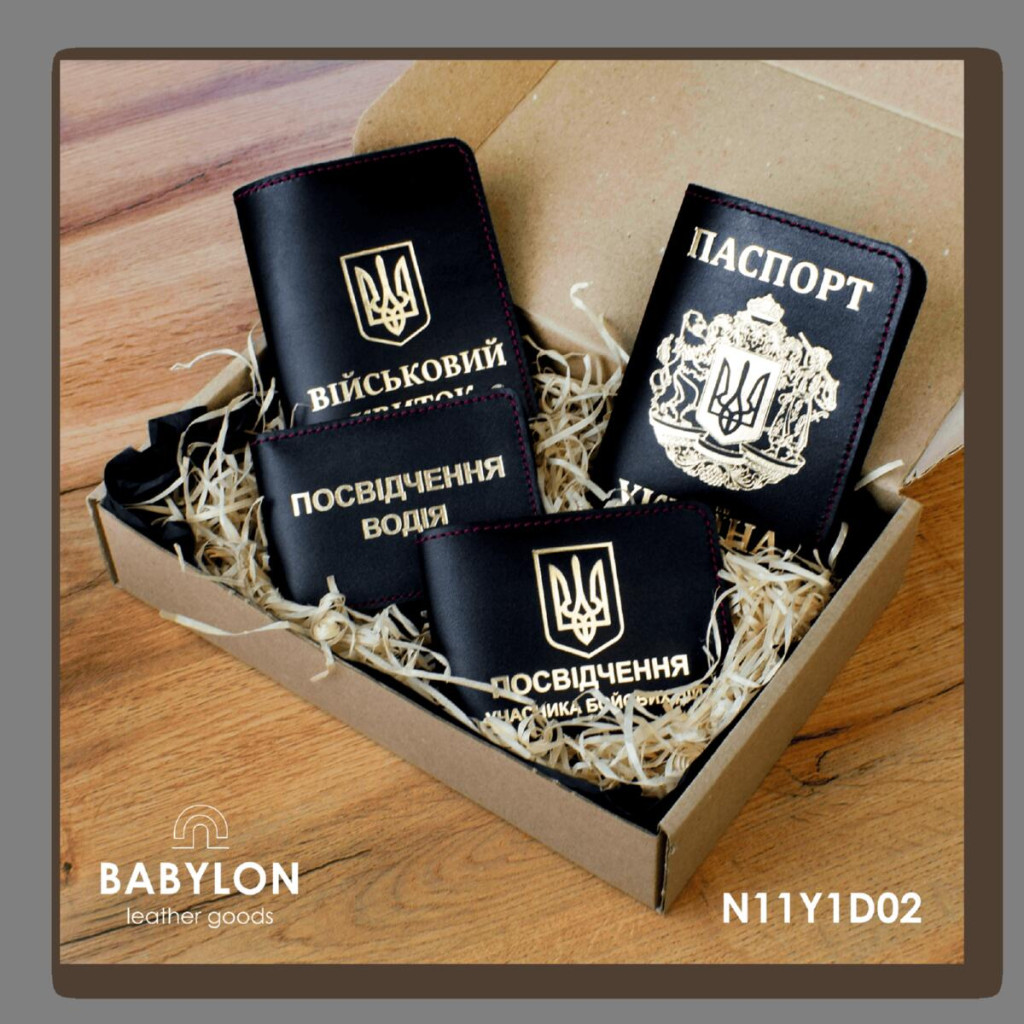 N11Y1D02 Babylon Набір обкладинок: військовий квиток, УБД, посвідчення водія та Паспорт 26x17x5 см чорний, золоте тиснення, червона нитка, шкіра
