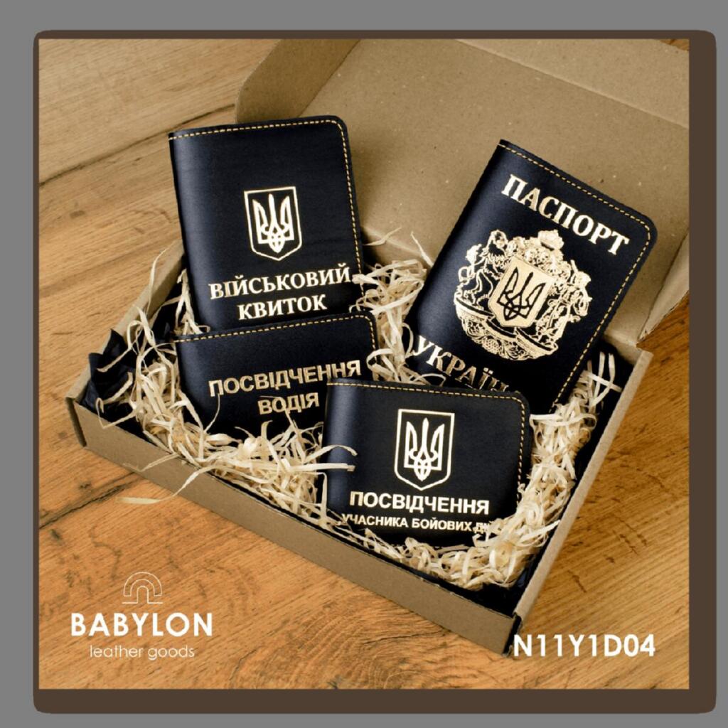 N11Y1D04 Babylon Набір обкладинок: військовий квиток, УБД, посвідчення водія та Паспорт 26x17x5 см чорний, золоте тиснення, жовта нитка, шкіра