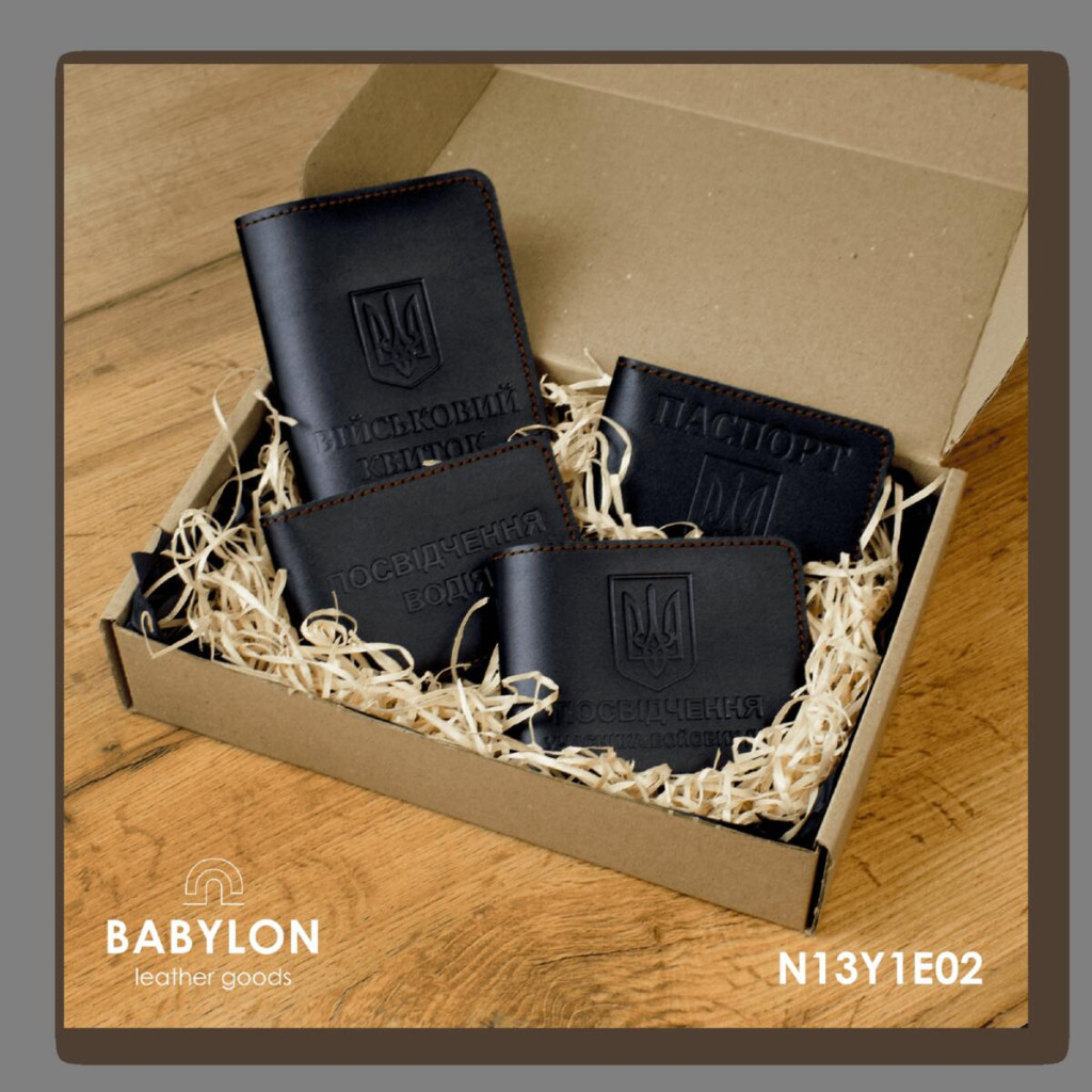 N13Y1E02 Babylon Набір обкладинок: військовий квиток, УБД, посвідчення водія та ID-паспорт 26x17x5 см чорний, чисте тиснення, червона нитка, шкіра